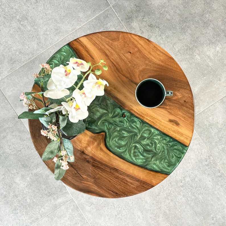 Crafted to bring a touch of sophistication to any living space, this Walnut Round Coffee Table seamlessly blends the warmth of wood with the modern charm of epoxy resin. The captivating epoxy river design running through the table top showcases a harmonious fusion of nature-inspired aesthetics. This versatile piece functions beautifully as a centerpiece in a living room or as a stylish addition to a patio bistro set.