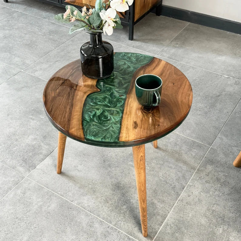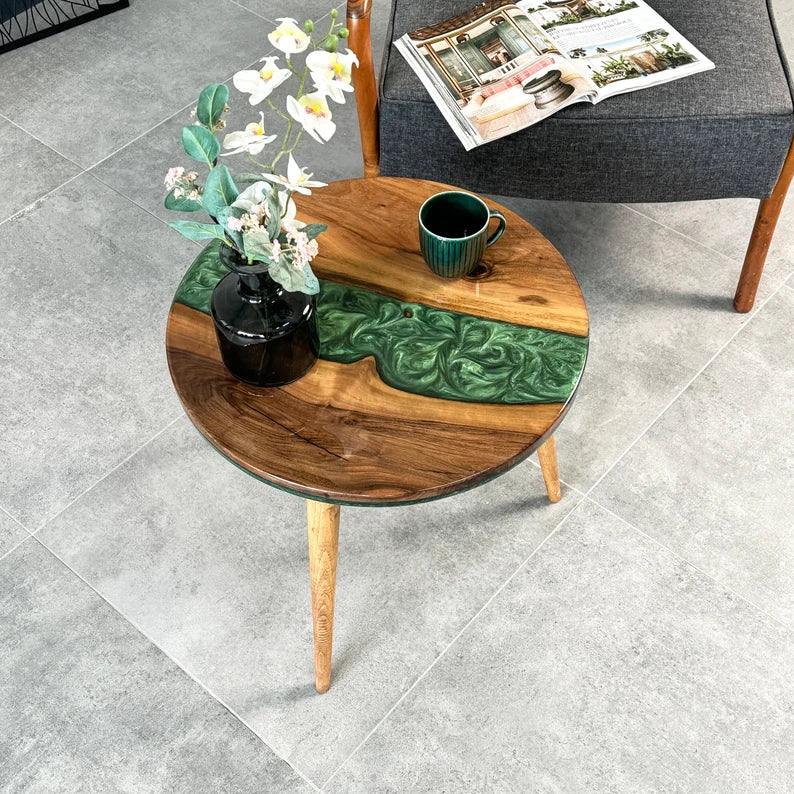Round Live Edge Resin Coffee Table Walnut Side Table Mid Century Modern End Table with Wooden Legs Handmade
